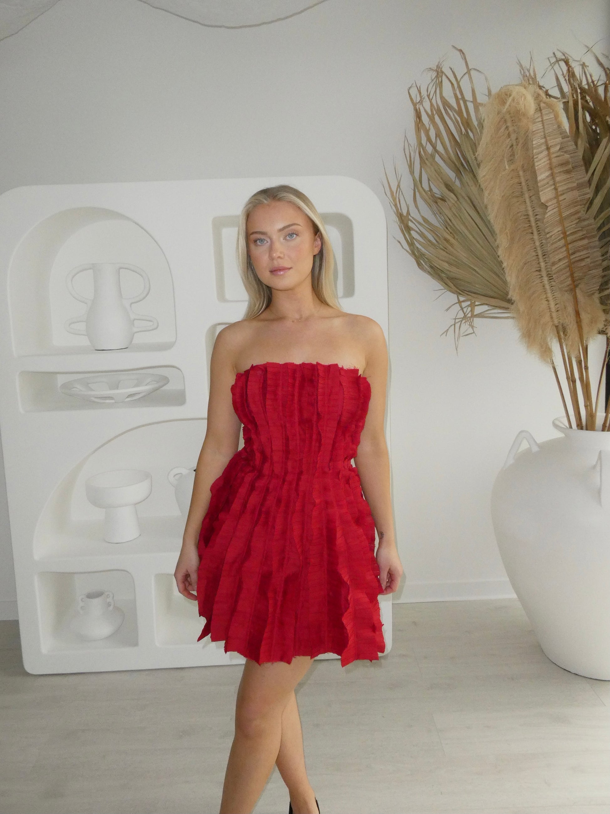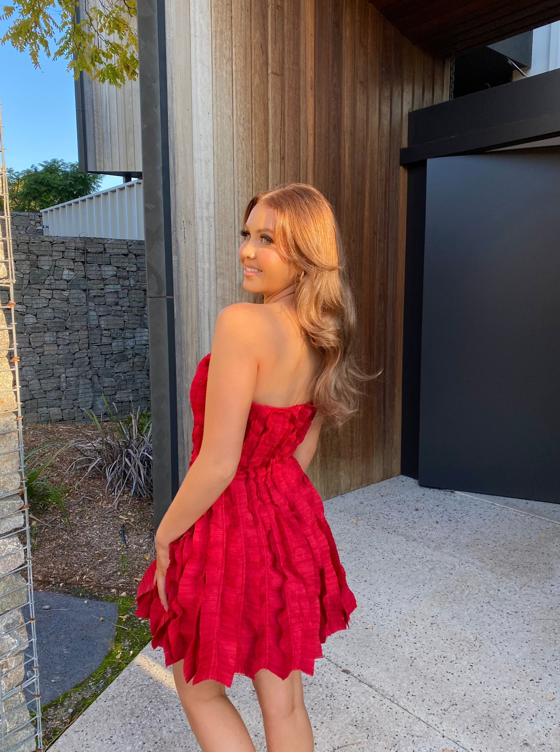 The AJE Hybrid Sleeveless Mini in Scarlet Red is a strapless mini dress has a fused, fitted bodice and pleated strips throughout with raw cut edges. Featuring side seam pockets with a full lining and invisible zipper at back. This hire piece is strictly dry clean only.