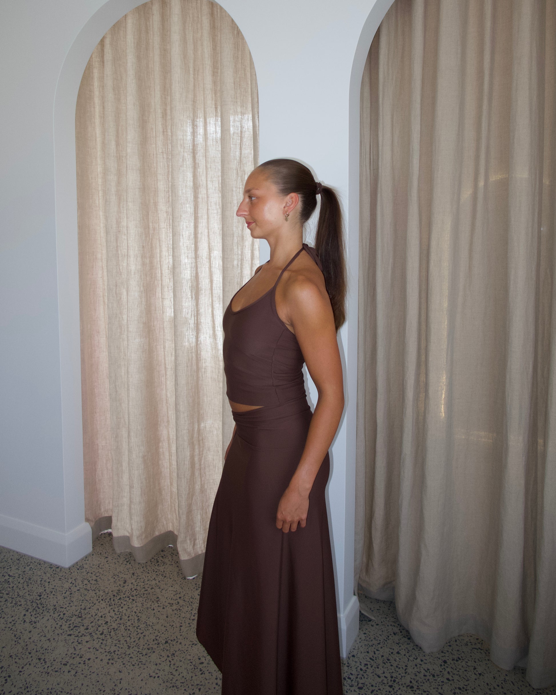 The Mr Winston Jemima Set in Espresso includes a full length skirt and adjustable halter neck top. This hire piece is strictly dry clean only.