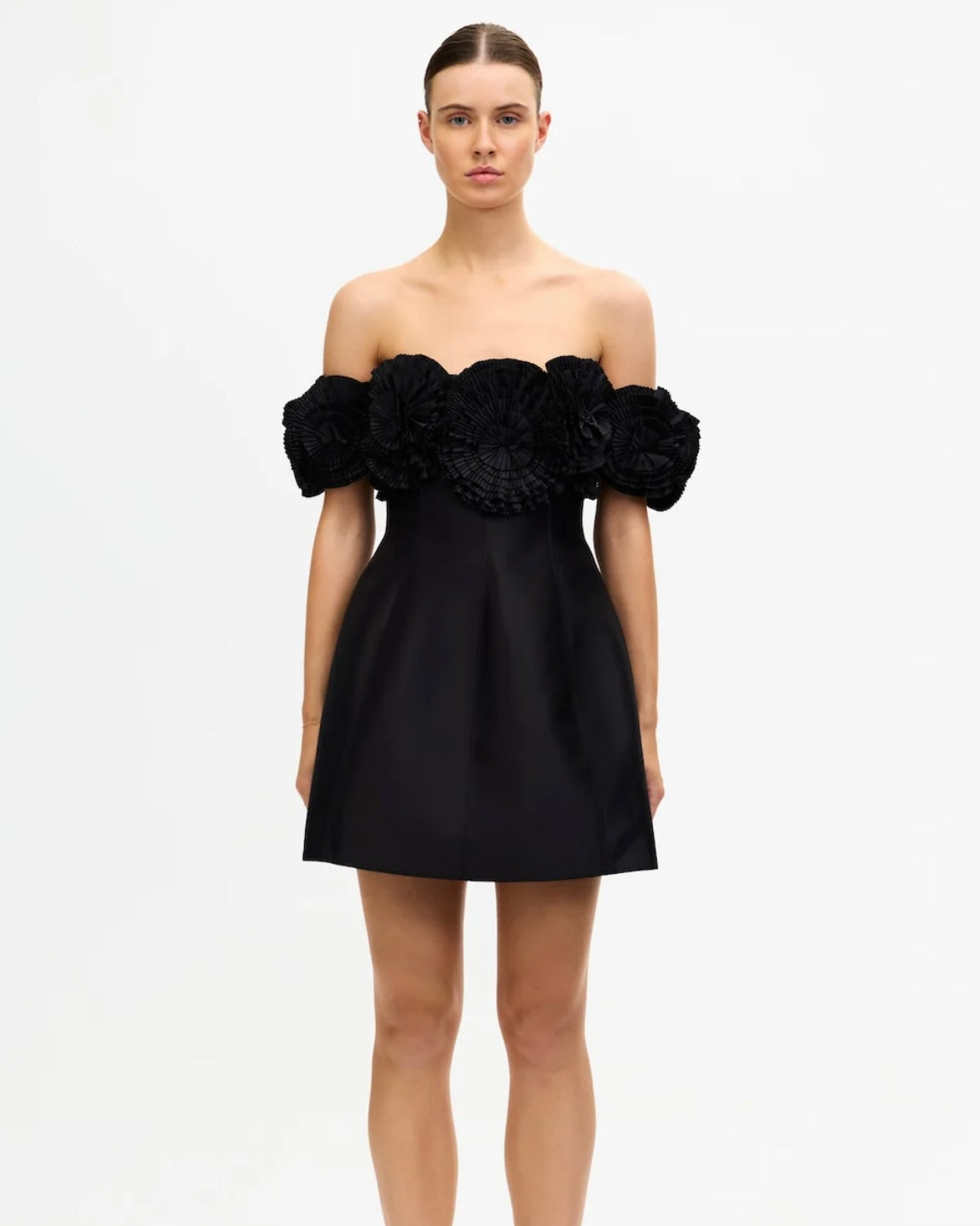 The Acler Trusley Mini Dress in Black, a statement of sculptural elegance. Crafted from heavy satin, this off-the-shoulder silhouette features a striking tulip-style bodice, enhanced by delicate rosette details that frame the neckline and sleeves. Fully lined for a smooth fit, this refined mini dress is finished with a centre-back invisible zip for a seamless look. A bold yet feminine choice for elevated occasion dressing.